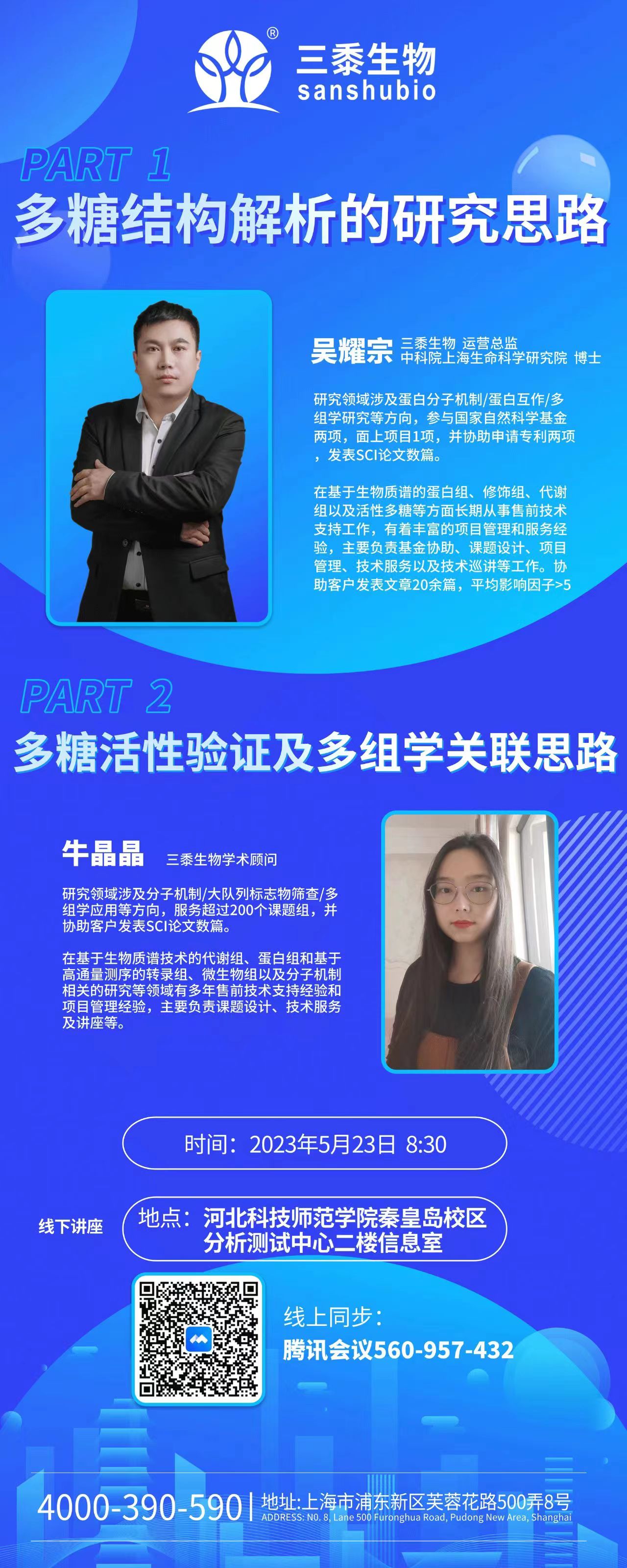 主讲内容:1.多糖结构解析的研究思路,主讲人:吴耀宗(三黍生物运营总监);2.多糖活性验证及多组学关联思路,主讲人:牛晶晶(三黍生物学术顾问)。