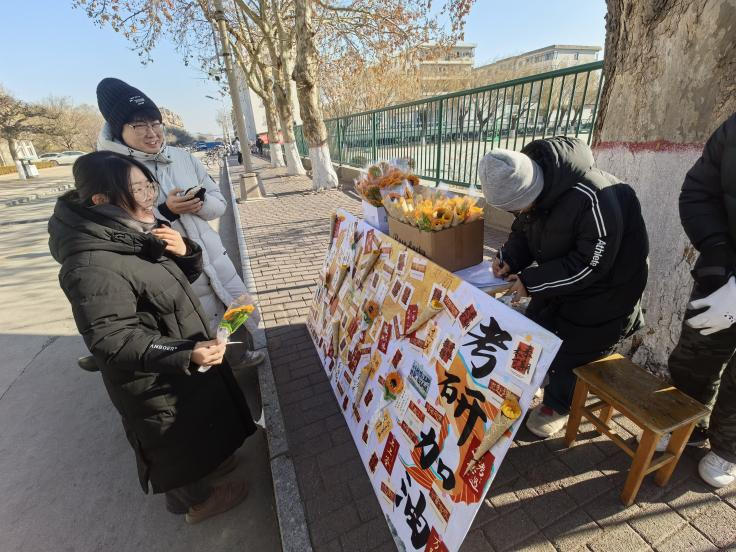 活动中,低年级同学自发参与,精心绘制励志展板、手写祝福贺卡;学院也特别准备了寓意“一举夺魁”的向日葵花束。贺卡上,“笔锋所至,梦想花开”“披星戴月走过的路,终将繁华满地”等真挚话语,承载着全院师生对考研学子的深切鼓励与殷切期盼。
